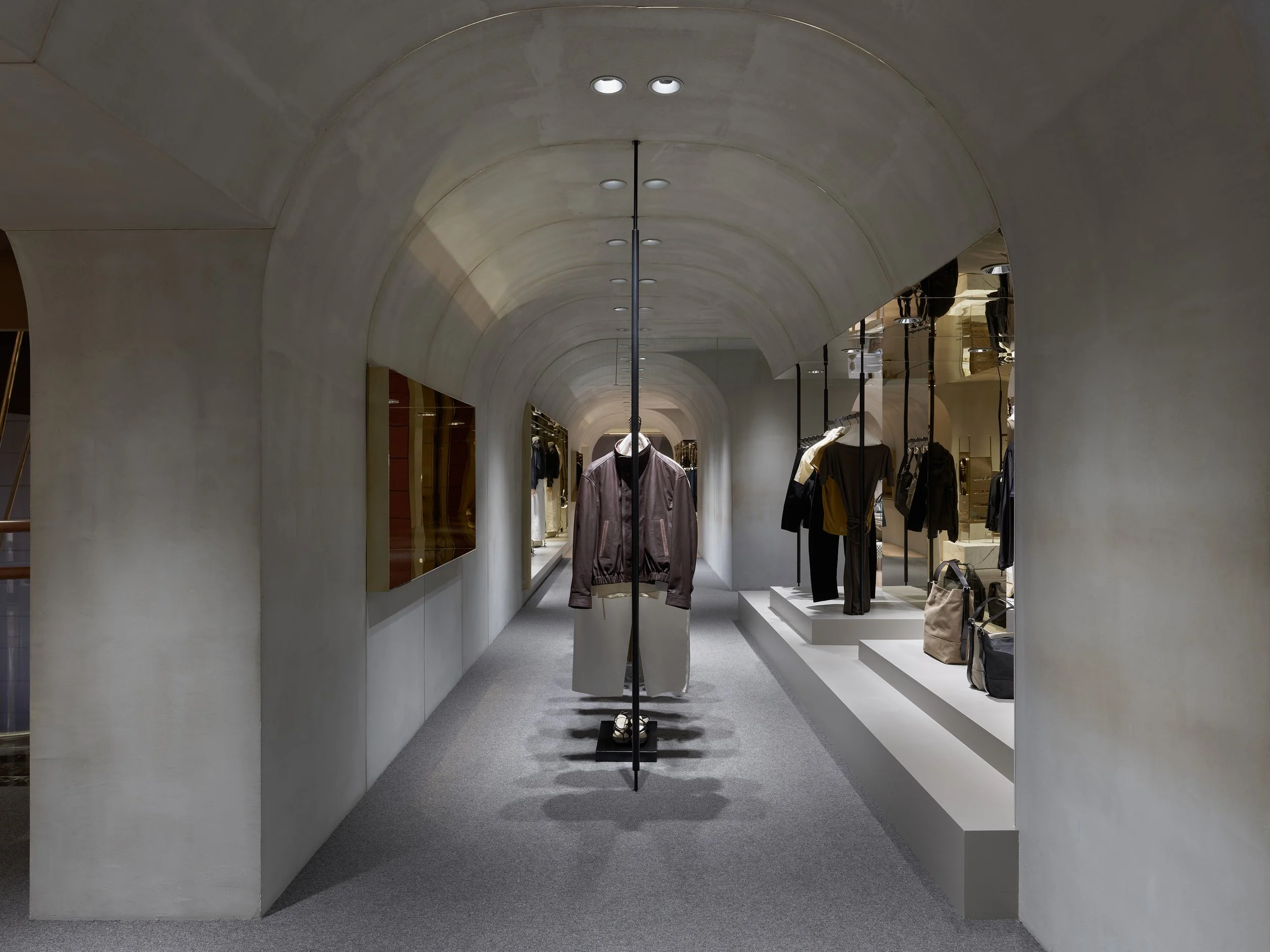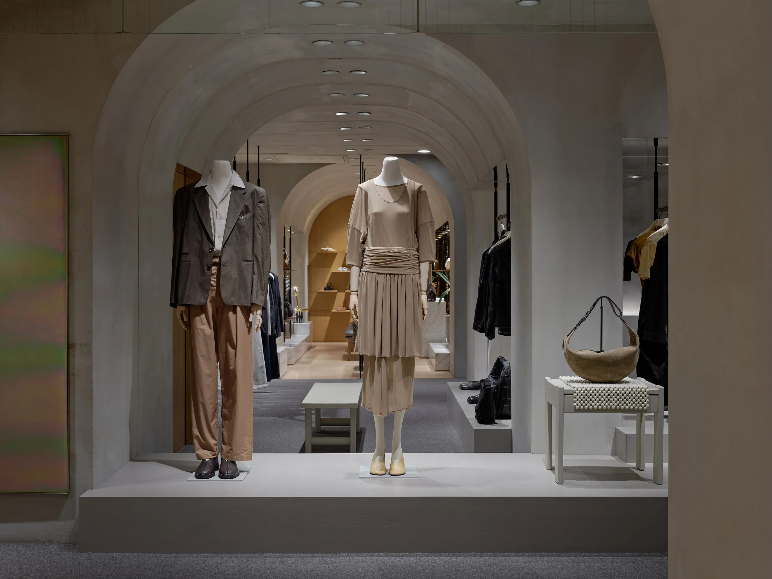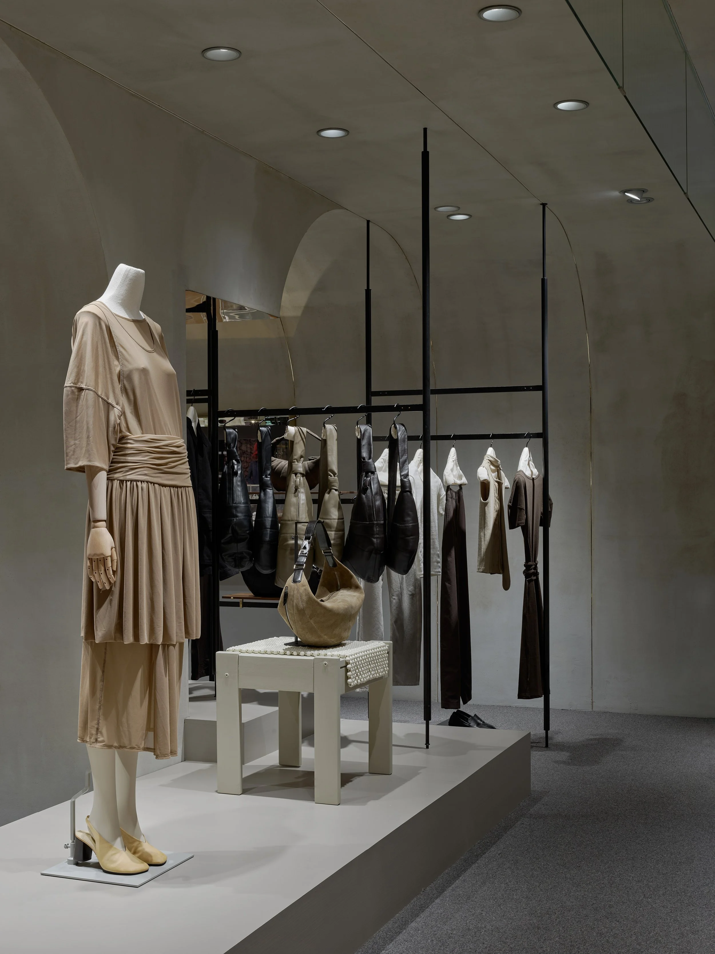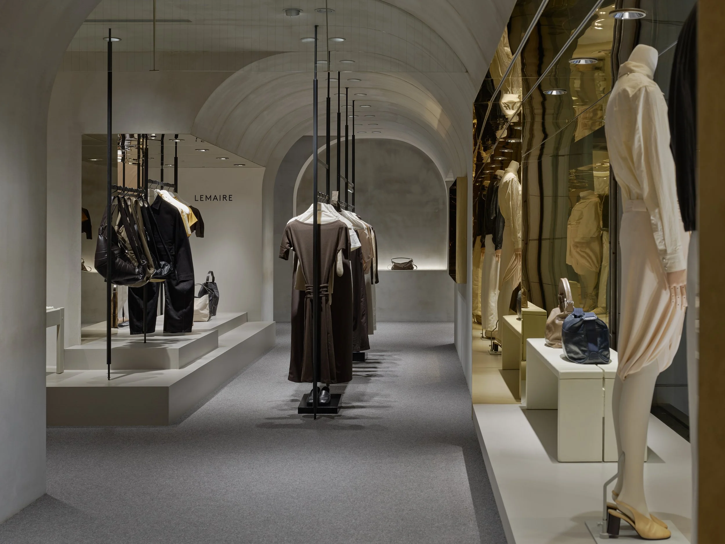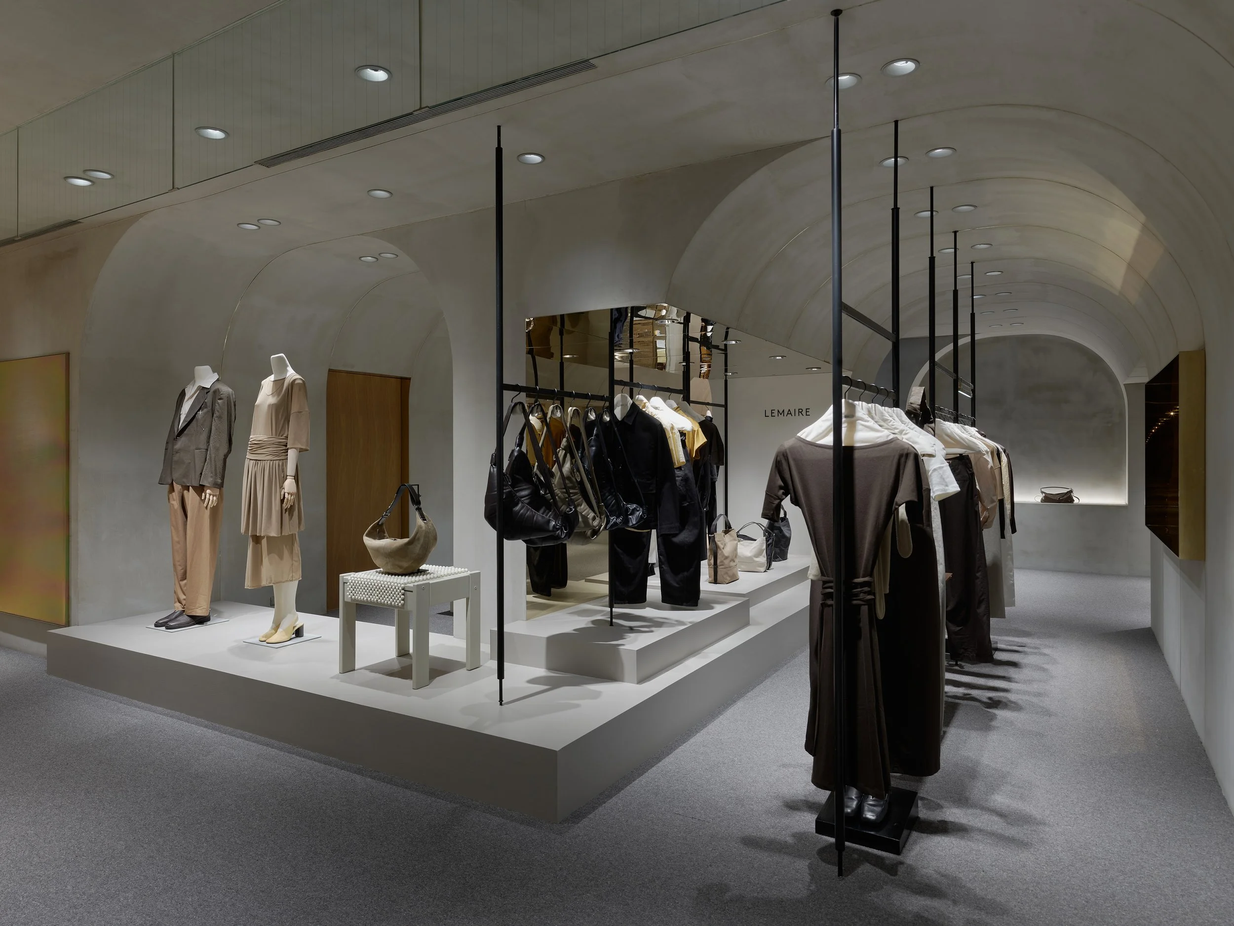 The space is anchored by a grey-toned wool carpet, complemented by warm wood surfaces that allow textiles and materials to subtly interact with shifting light. The result is an environment that feels composed, restrained, and quietly layered. Eschewing overt decoration or prominent signage, the store features only a discreet metal logo bearing the LEMAIRE name—an understated gesture that reflects the brand’s refined cadence. An open, fluid layout guides movement naturally through the space, inviting visitors to engage with each piece from multiple perspectives.