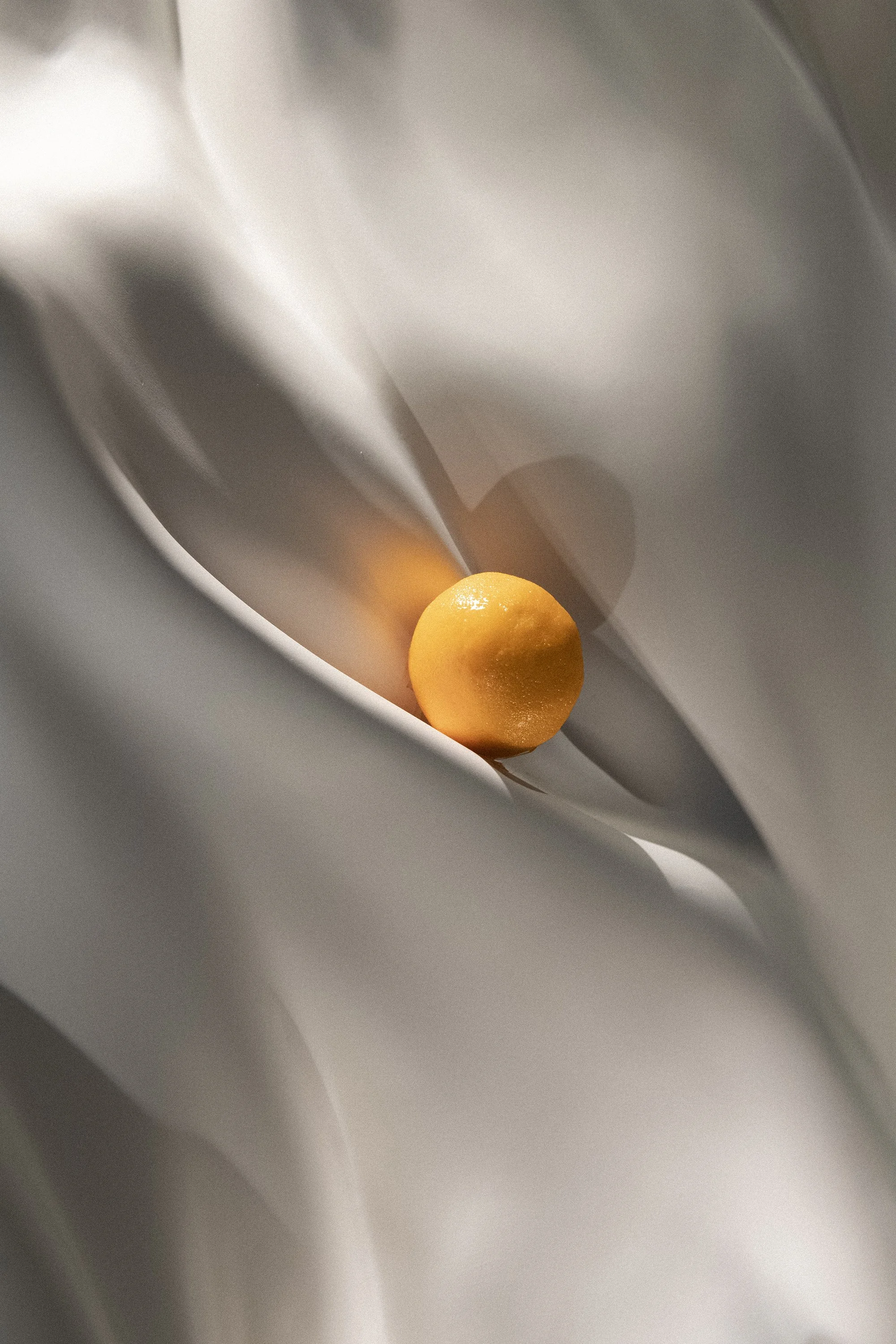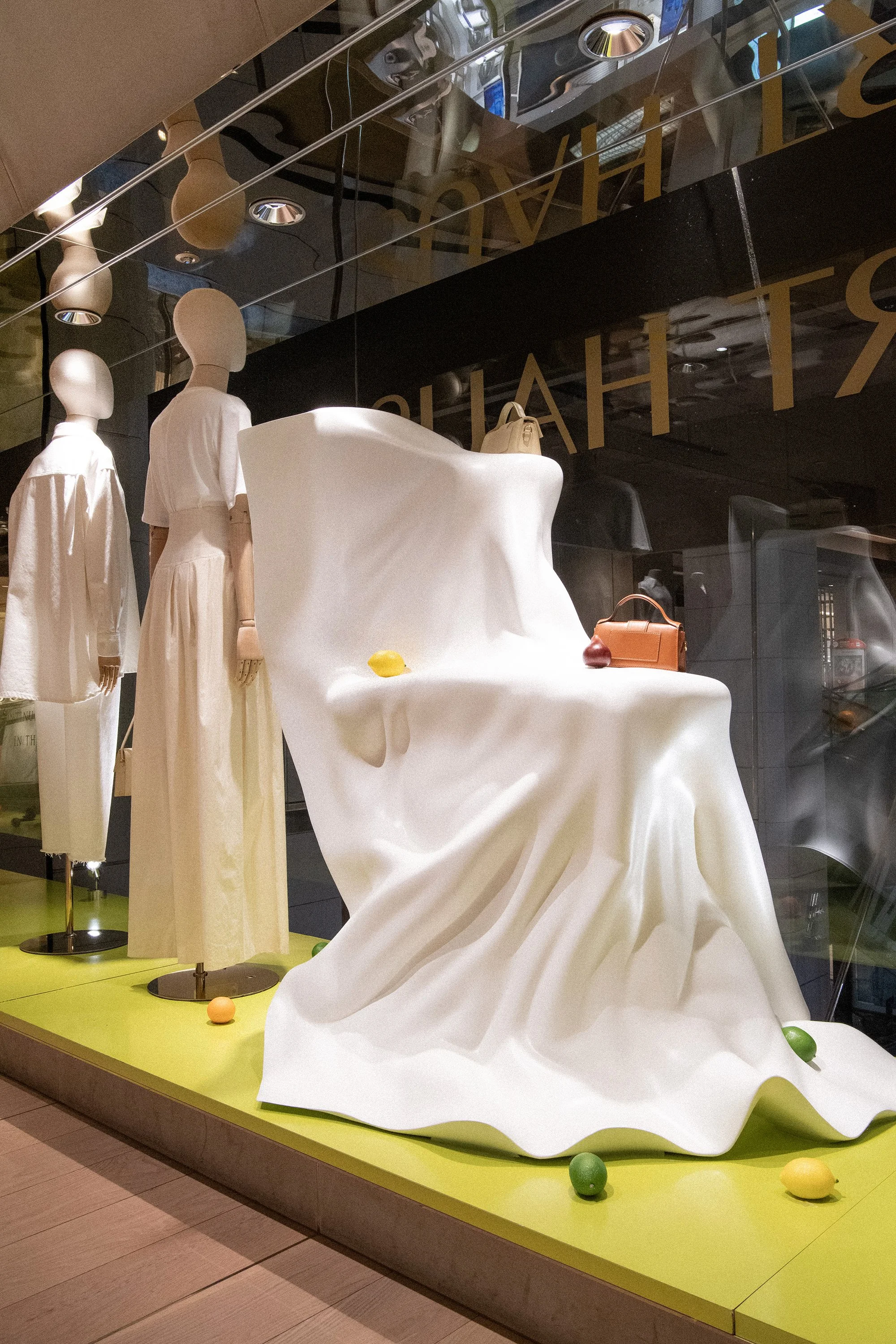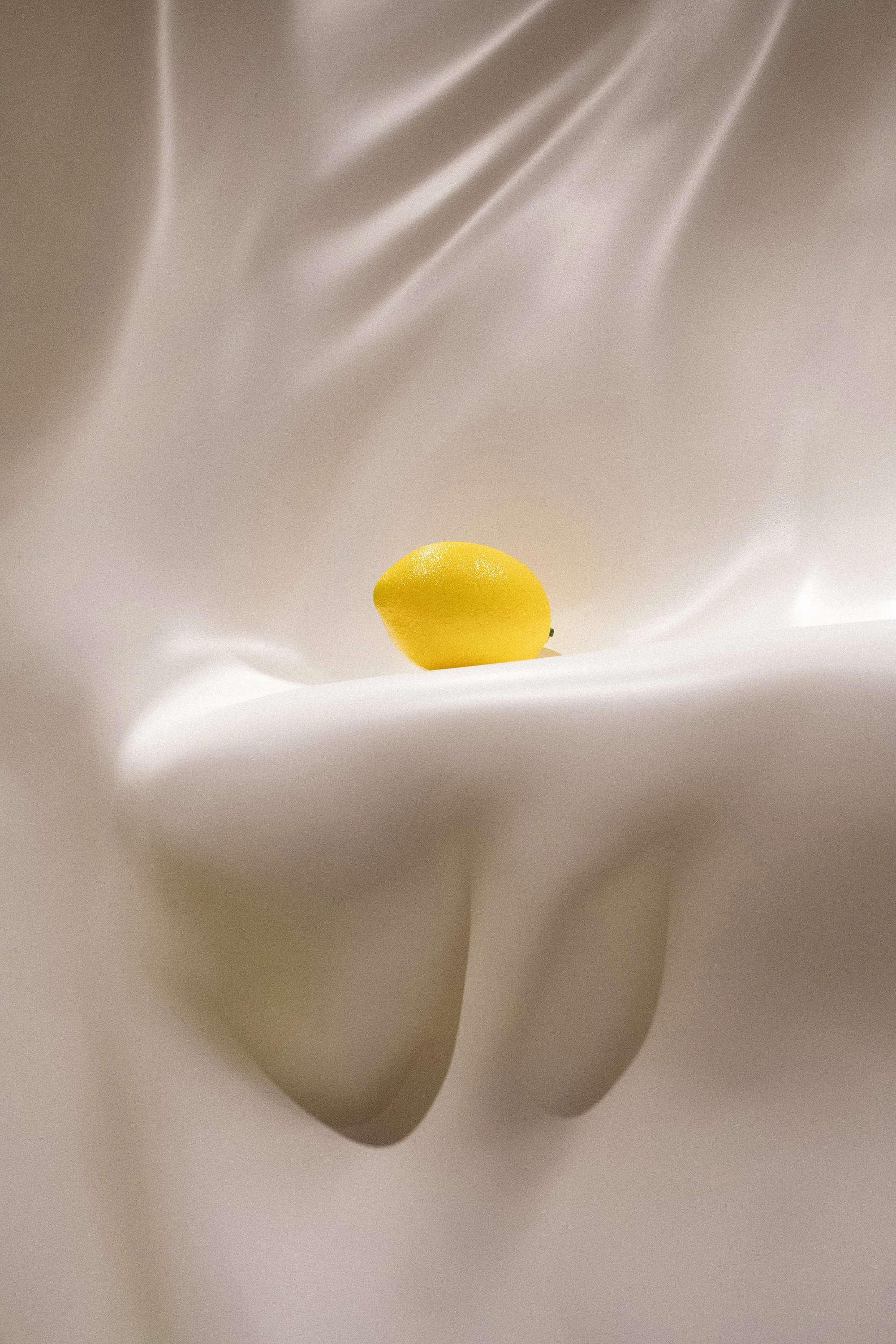 The display installation takes references from materials in still life art, including using fruits as the focal objects, fiberglass as the material for textile sculptures, and the triangular composition (S composition) to depict the snapshot moment of the dynamic movements of fabrics and fruits.