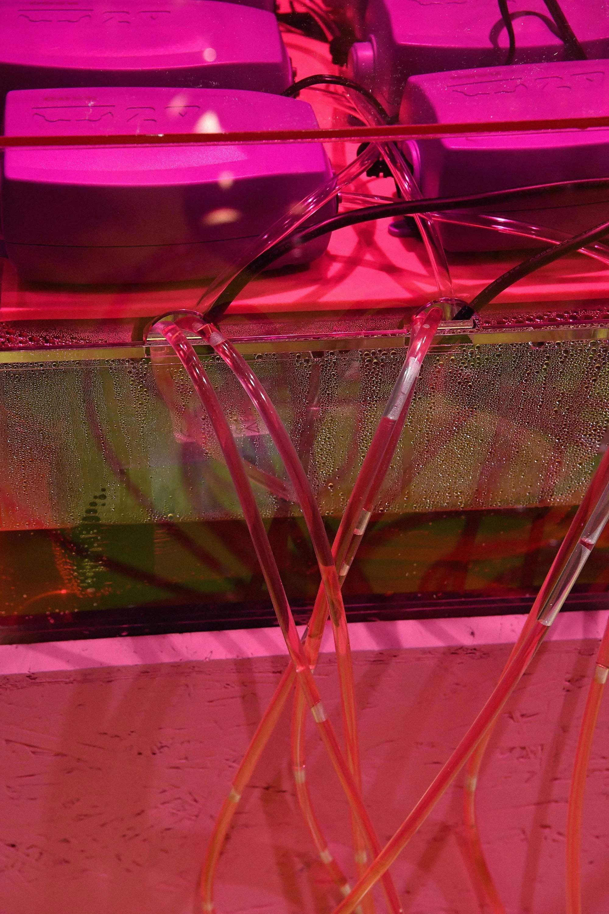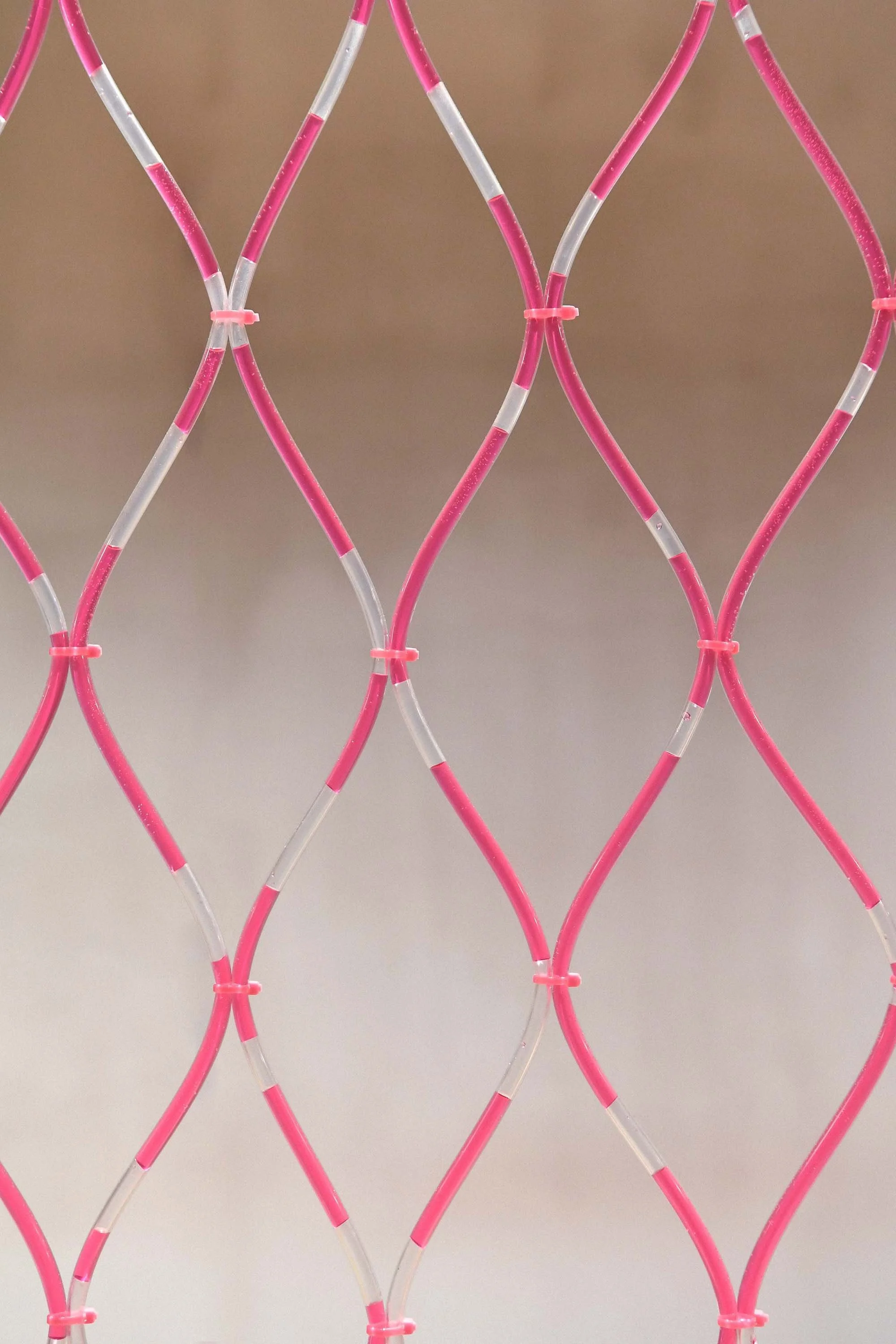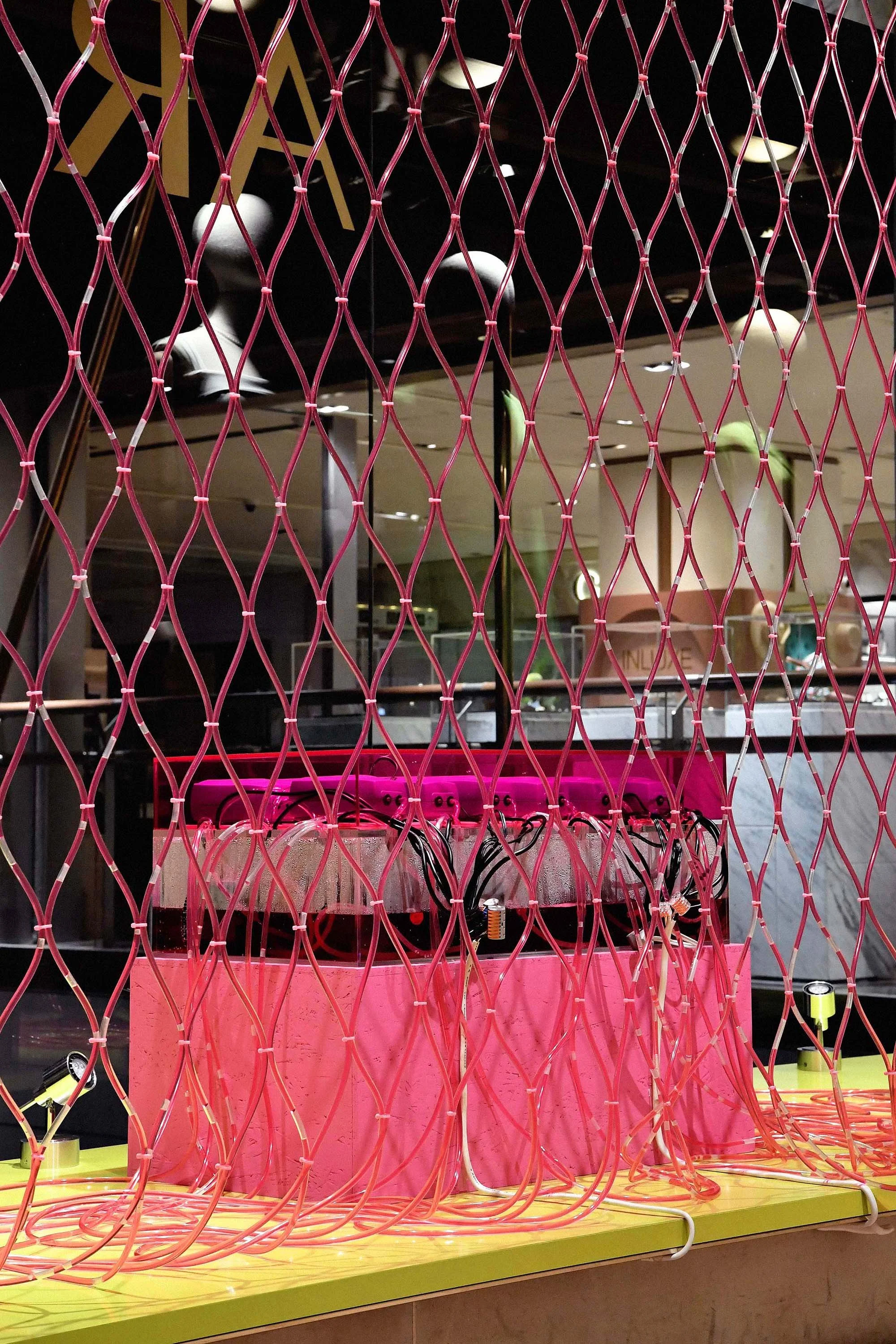 The installation makes references to a crocheted net, replacing woven yarns with transparent tubes to weave into a gigantic net that is suspended mid-air in the display window. In the middle of the art piece, there is a water tank with pink liquid inside that flows through these tubes when pumped by a motor. The color changes as the liquid moves through, forming a dynamic and artistic scenery along the way.