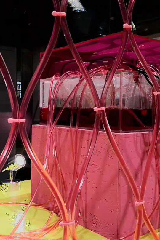 裝置設計參考鉤針編織的形狀,以透明水管代替原本的毛線材質,編織成巨型的網狀裝置懸掛於櫥窗內。裝置中間擺放了一個裝有粉紅色液體的水箱,粉紅色液體在沉水馬達的加壓下,快速流竄於編織的透明水管內,在流動之間產生顏色的細膩變化。